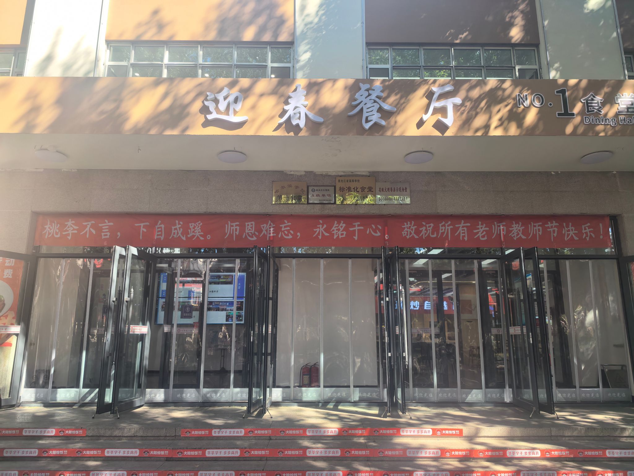 清晨的第一缕阳光洒满校园时,一食堂已悄然变身成为一片彩色的海洋。入口处,一幅幅写满祝福语的横幅高高悬挂,如“桃李不言,下自成蹊。师恩难忘,永铭于心”、“三尺讲台系国运,一生秉烛铸民魂”,字里行间流露出学生们对老师的无限敬仰与感激。走进食堂内部,更是别有一番天地:桌面上整齐排列着各式各样的多肉植物,它们或圆润饱满如珠玉,或亭亭玉立似佳人,每一株都承载着满满的心意和美好的祝愿。
