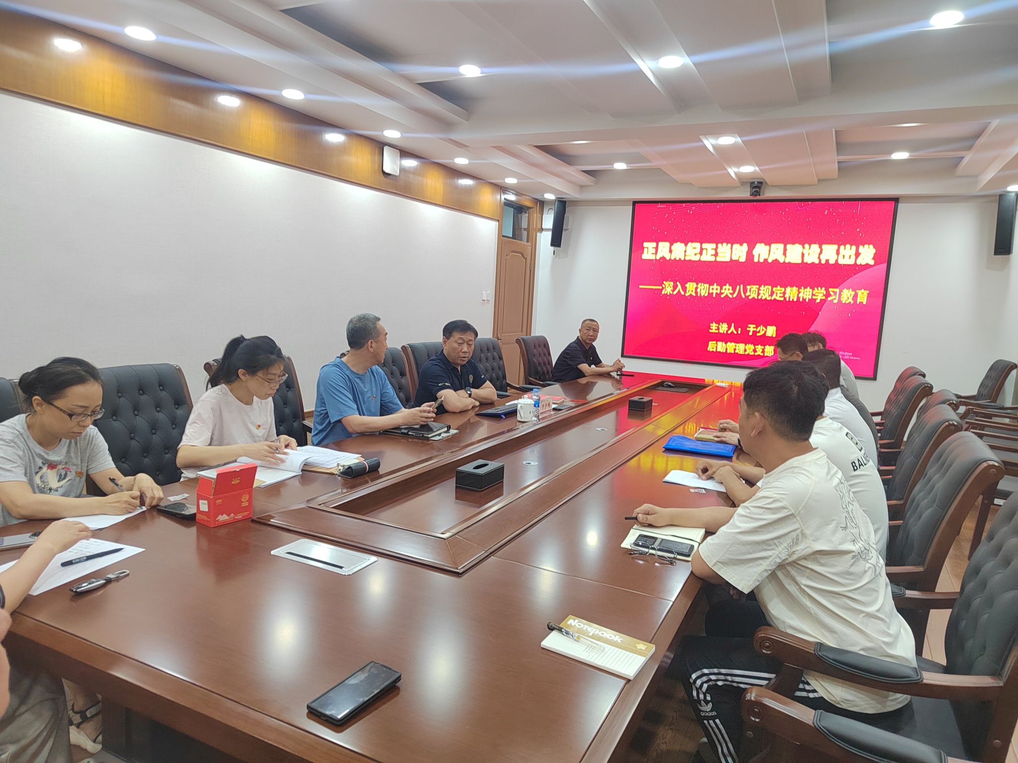 7月7日下午15点,副校长于少鹏同志在行政楼417会议室,为后勤管理党支部全体党员上了一堂题为“——深入贯彻中央八项规定精神学习教育”的专题党课,旨在进一步加强后勤管理党支部的作风建设,推动全面从严治党向纵深发展。