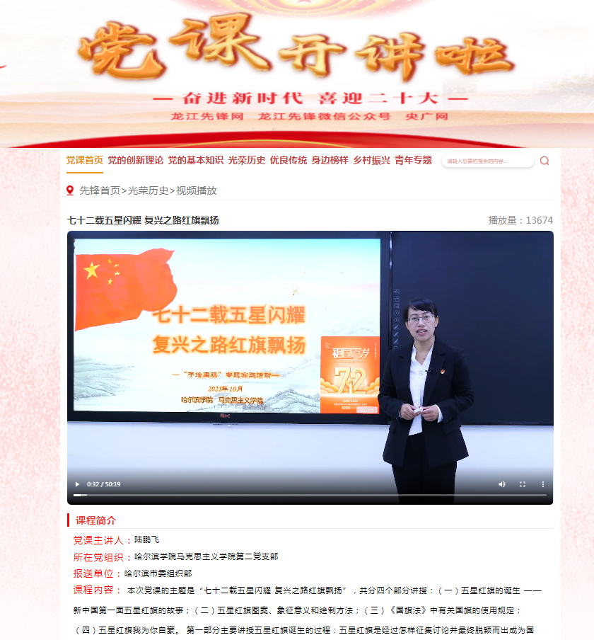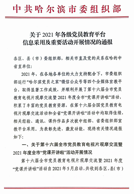 此次活动是2021年市委组织部利用“哈尔滨党员之家”微信公众号等四个全媒体宣教平台,开展的第十六届全市党员教育电视片观摩交流暨2021年度全市“党课开讲啦”活动,多门精品党课被中组部、省委组织部宣教平台采用,优秀作品将汇编成辑,纳入全市党员教育教学资源库,并在《时代先锋》党建电视栏目、“哈尔滨先锋网”、“哈尔滨党员之家”微信平台、“哈组弘”抖音号集中展播。
