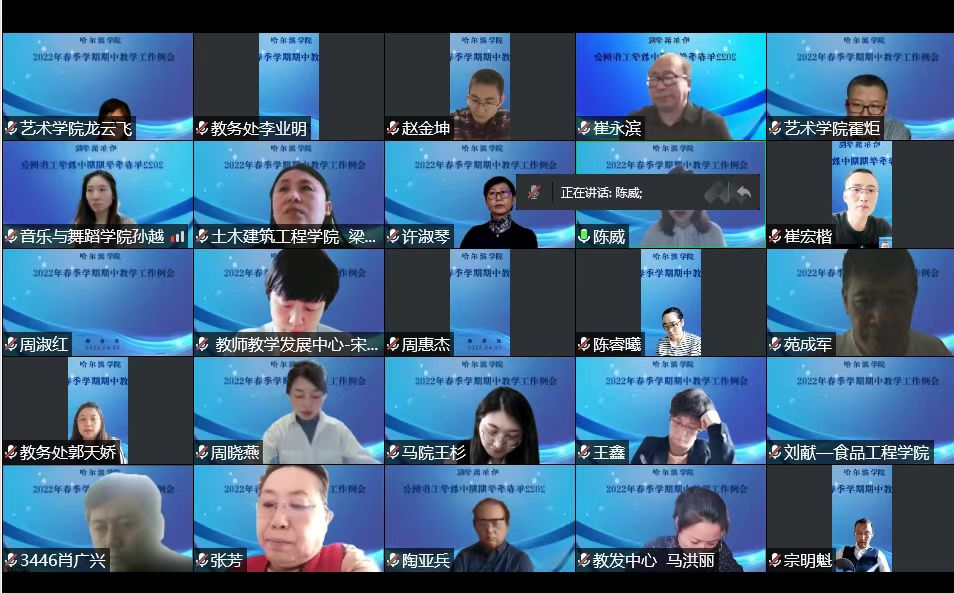 4月26日,学校2022年春季学期期中教学工作例会在线顺利召开。教务处全体成员、教师教学发展中心和教学质量评估中心副处级以上干部、校级教学督导、二级学院院长、副院长、专业负责人和教学秘书等110余人在线参加了本次会议。工会主席陈威出席并讲话。
