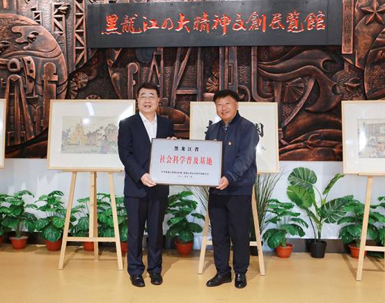 党委副书记、校长于成学接受省委宣传部、省社科联授予我校的“黑龙江省社会科学普及基地”铭牌。
