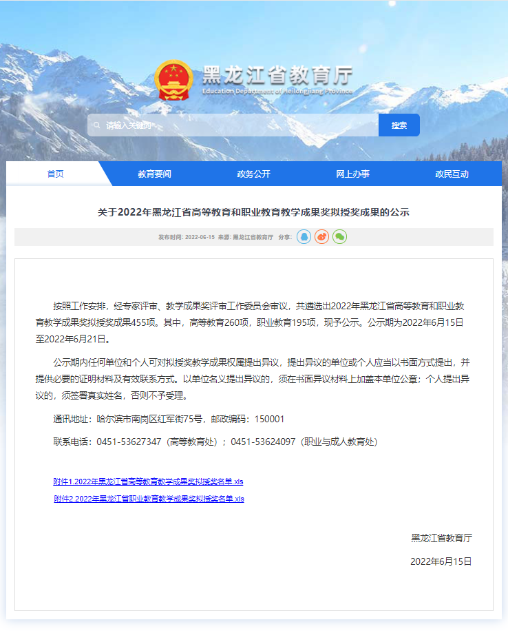 (文/马彦龙)日前,黑龙江省教育厅发布了2022年黑龙江省高等教育和职业教育教学成果奖评审结果。我校喜获省级教育教学成果奖6项,其中一等奖1项,二等奖5项。