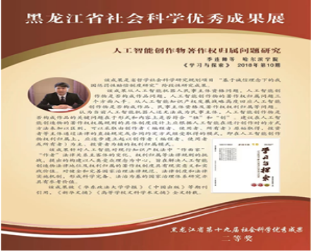 近五年来,作为独立和第一作者在《江汉论坛》《学习与探索》等国家社科基金资助期刊发表学术论文10余篇,其中《人工智能创作物著作权归属问题研究》一文被《新华文摘》和《高等学校文科学术文摘》全文转载,该研究成果从人工智能机器人民事主体资格问题,人工智能创作物是否构成作品问题,人工智能创作物的著作权归属问题三个方面入手展开研究,对健全和完善国家治理法律规范、法律制度和法律实施机制,形成科学完备、法治为基的国家治理体系研究具有参考价值。作为重要成员参与国家社会科学基金重大项目1项、一般项目1项,主持黑龙江省哲学社会科学规划项目3项,黑龙江省学术著作资助出版项目2项,黑龙江省高等教育教学改革项目2项,哈尔滨市社科联调研课题4项;科研成果获黑龙江省社会科学优秀成果二等奖2项、三等奖1项,哈尔滨市社会科学优秀成果一等奖1项、二等奖2项;出版学术著作2部。