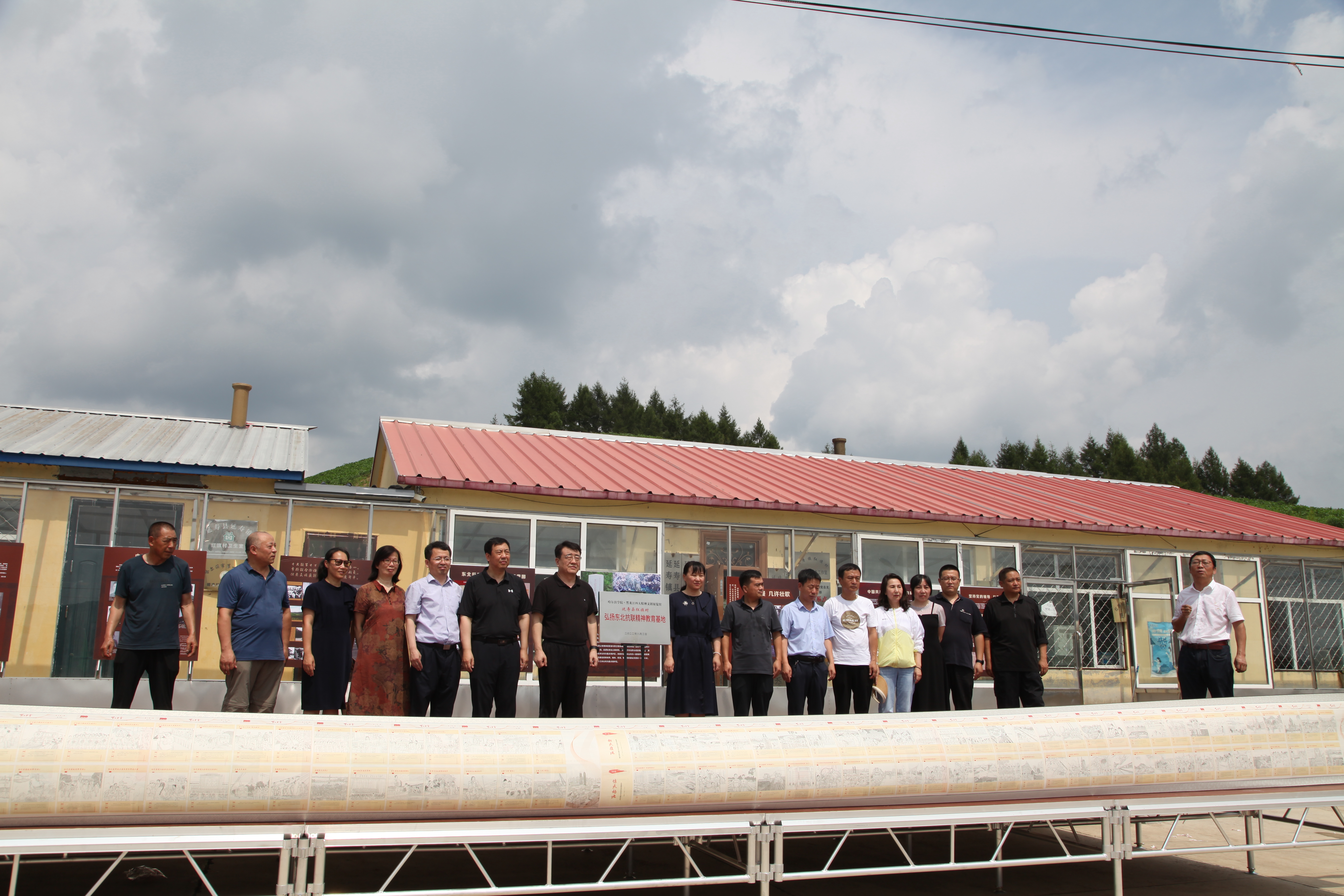 在村委会,于成学与延寿县相关负责同志及驻村工作队进行座谈,详细了解了乡村振兴工作开展情况,共同研究推动乡村产业振兴举措。李颖部长对哈尔滨学院近年来给予延寿县红旗村的关心、帮扶和支持表示感谢,并表示,将一如既往地支持驻村工作队开展好各项工作,解决好工作队队员生产生活困难,为不断巩固拓展脱贫攻坚成果,推动实现脱贫地区发展和乡村全面振兴打下坚实基础。于成学指出,要继续发挥高校的人才和智力优势,因地制宜,精准施策,巩固脱贫攻坚成果,有效衔接乡村振兴,为建设“六个龙江”,打造“七大都市”贡献哈尔滨学院智慧和力量。座谈会后举行了哈尔滨学院黑龙江四大精神文创展览馆延寿县红旗村弘扬东北抗联精神教育基地揭牌仪式。于成学强调,要充分发挥文化在乡村振兴中的作用,挖掘和利用红旗村东北抗联遗址,赓续红色血脉,传承东北抗联精神。