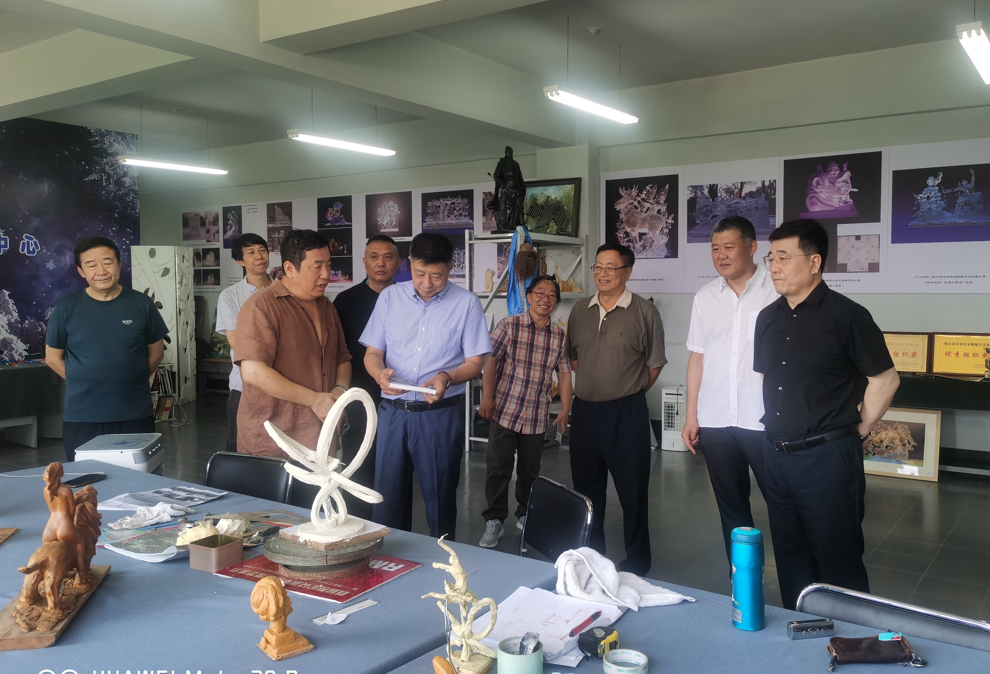 才大颖理事长一行参观了我校教师被中国共产党党史纪念馆、中国国家博物馆收藏的国画、连环画作品以及为中央大街等地设计落地的雕塑作品,观看了创意设计作品展览,实地踏访了工艺美术、影像艺术、服装设计、冰雪文化研究中心、沙画教学研究中心、数字媒体、地铁壁画等十几个工作室,详细了解学校创意设计类专业的人才培养、教育教学、科学研究和成果转化等相关情况。才大颖理事长对我校创意设计团队的水平和架构高度赞赏;对能成为哈尔滨市地方性珍贵的伴手礼产品《哈尔滨 百年华章》手绘,《哈尔滨印象》线描、瓷刻,《铜马车》雕塑,《冰雪蓝染》工艺品、《冰城美景》漆画、《冰清玉洁》冰雪陶瓷琉等充分肯定;对我校与五常市泥塑,与铁力市、延寿县绿色产品包装,与阿荣旗的红色场馆建设,与五大连池市、依安县的“冰凌陶瓷”产品研发等产教融合、校企合作取得的成果高度评价。