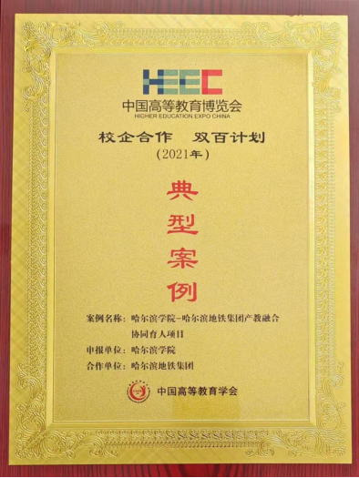 会上,举行了2021-2022年度中国高等教育博览会“校企合作 双百计划”典型案例授牌仪式。我校申报的《哈尔滨学院-哈尔滨地铁集团产教融合协同育人项目》经中国高等教育学会专家评选、走访答辩,荣获2021-2022年度中国高等教育博览会“校企合作 双百计划”典型案例,并在第六届产教融合发展大会上受到表彰。