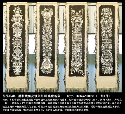 杨眉副教授获奖作品《赫哲族鱼皮镂刻组画盛世新象》文化内涵深厚、风格鲜明独特、艺术技艺精湛。以根植于黑龙江赫哲族的祖先神话传说和原始图腾为创作蓝本,采用传统鱼皮镂刻结合现代构成的造型语言,展现赫哲族鱼皮艺术浑然天成的材质之美,淳朴古老技艺之精和神秘图腾的文化之韵。该作品曾获得“第十五届中国民间文艺山花奖入围作品奖”“中国工艺美术创新作品大赛金奖”“第一届黑龙江省文学艺术英华奖”。杨眉副教授还曾主持完成国家艺术基金《黑龙江流域少数民族鱼皮与桦树皮艺术创作人才培养项目》和国家艺术基金青年艺术创作《关东记忆项目》,是我省唯一获批并主持完成两项国家艺术基金项目获得者,为黑龙江省传统工艺人才培养,少数民族濒危技艺接续传承做出了突出贡献。