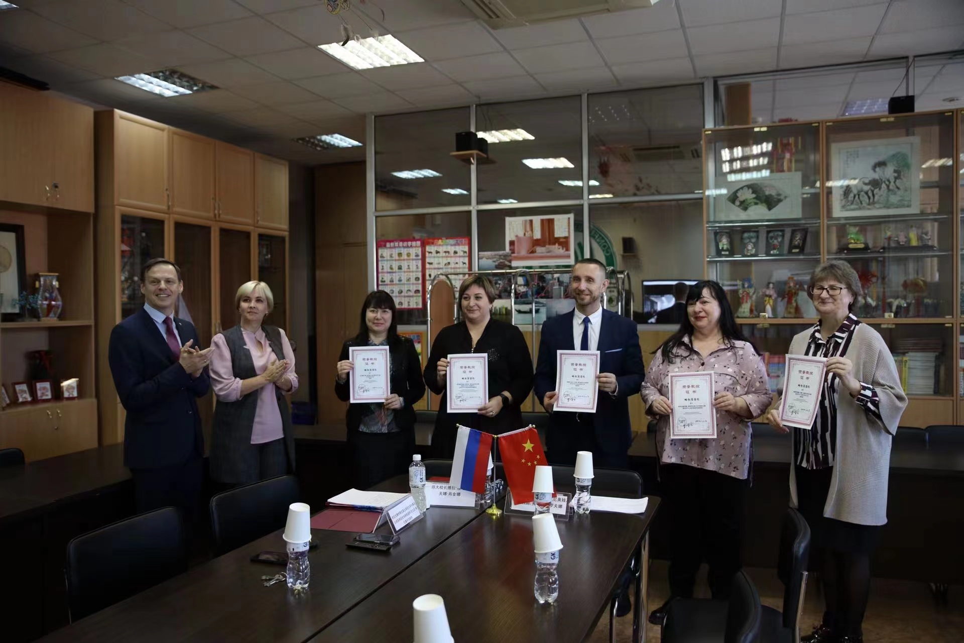 布拉戈维申斯克国立师范大学教育学与心理学系主任安娜托里耶夫娜、教育学与心理学教研室副教授瓦列里耶夫娜、体育文化与运动系主任基米尔洛维奇、外语系主任扎列斯卡娅,哈尔滨学院党政办公室主任刘振清、受聘教师等参加签约仪式。