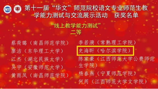 本届比赛由江西师范大学文学院承办,来自全国近80所院校的500名选手,以线上线下相结合的方式,参与了教学片段设计能力和线上教学能力两个环节的比拼。经过精彩展示与激烈角逐,我校汉语言文学专业的8名学生分获“教学设计能力测试”一等奖1项、二等奖1项、三等奖4项、优秀奖2项,“线上教学能力测试”二等奖5项、三等奖3项。