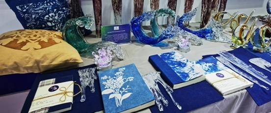 二是“冰雪蓝染”工艺美术文创系列产品。运用中国古老的传统植物染色的技艺,其天然环保的特质更重要的是传递一种绿色的生活方式。设计作品将创造力与生命气息的媒材相融合,凝聚了人类智慧结晶。我们本着传承与弘扬民族文化为宗旨,结合北方地域冰雪文化特质在继承和发掘传统制作技艺的同时,运用植物染色中的新技术、新材料、新工艺,通过对染色制作创新性艺术表现相结合的研究与应用。由李茉函老师指导并与学生共同制作完成的冰雪蓝染文创系列作品,如:家居抱枕系列雪花图案(红茶染)、鄂伦春图案(蓝染)、茶垫丁香图案和莲藕图案(蓝染)、鼠标垫丁香花和吉祥图案(蓝染)等创意设计作品,把冰雪设计元素有机融入其中,使北方地域特色更加丰富。生活艺术化的设计理念中,又突出了艺术生活化,使百姓的生活空间散发着哈尔滨市花的味道和冰雪文化的力量。通过哈尔滨经典的冰雪文化的融合,使地域性文化艺术能够得到关注与展示。