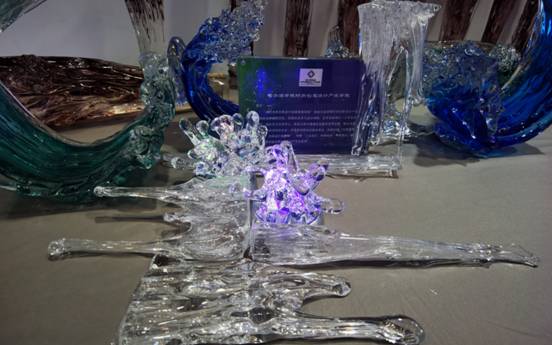一是“冰凌柱”“冰溜瀑”“冰花海”主题系列装置和摆件作品。以北方冰天雪地里所形成光怪陆离的冰溜子、冰花等为创作元素,创作出高耸而起不同形态、不同肌理的冰凌柱;下垂流淌不同长度、似断又连的冰溜瀑;形似珊瑚或花瓣,大小不同、高低起伏的冰花海。还有冰凌花、树叶树枝、冰排冰浪等造型的摆件。这些作品,在室内一年四季都可以看到,好似欣赏完“哈尔滨冰雪大世界”后常年可以留给观众的冰雪记忆。这是我校第一次在冰雪琉璃创意设计的研究与尝试。
