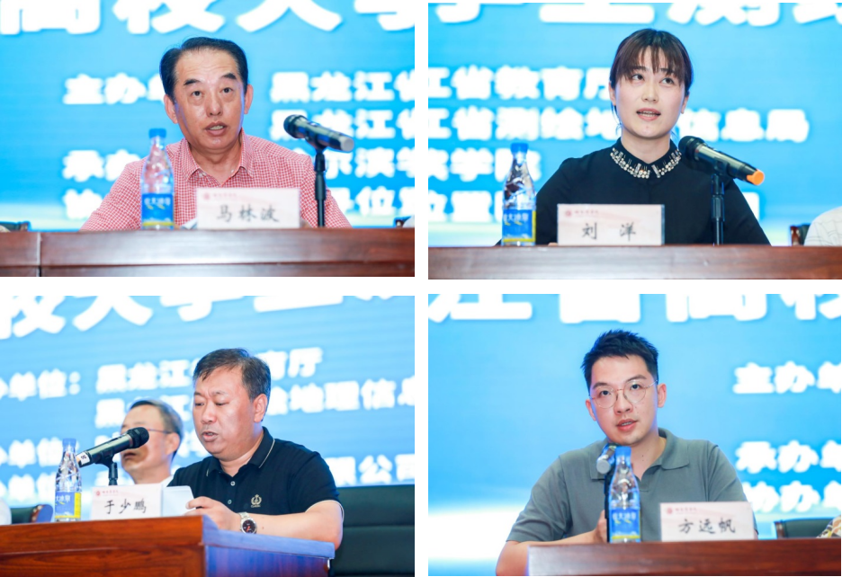 开幕式上,省测绘地理信息局副局长马林波、省教育厅创新创业教育负责人刘洋、中国测绘教育工作委员会委员付开隆、千寻位置网络有限公司智能飞行业务部总经理方远帆分别代表主办方、协办方和裁判员队伍致辞。副校长于少鹏在致辞中向所有来宾介绍了学校自2019年步入黑龙江省“特色应用型本科示范高校”和 “深化创新创业教育改革示范高校(培育)”行列以来,学校党委坚持以习近平新时代中国特色社会主义思想为指导,科学确立了政治建校、教学立校、科研强校、文化育校、改革活校、人才兴校、和谐安校的“七校战略”和全面深化改革的成绩概况与大会的筹备情况。与会嘉宾一致认为,本次大赛规模空前,是省内高校测绘类相关专业与行业企业沟通的纽带,是参赛高校之间相互学习、沟通与交流的桥梁和平台,更是实现“以赛促教,以赛促学,以赛促创”、营造练就真本领的学风、激发更多学生自发学习技术、苦练各种技能,培养出更多更优秀测绘人才的大赛。