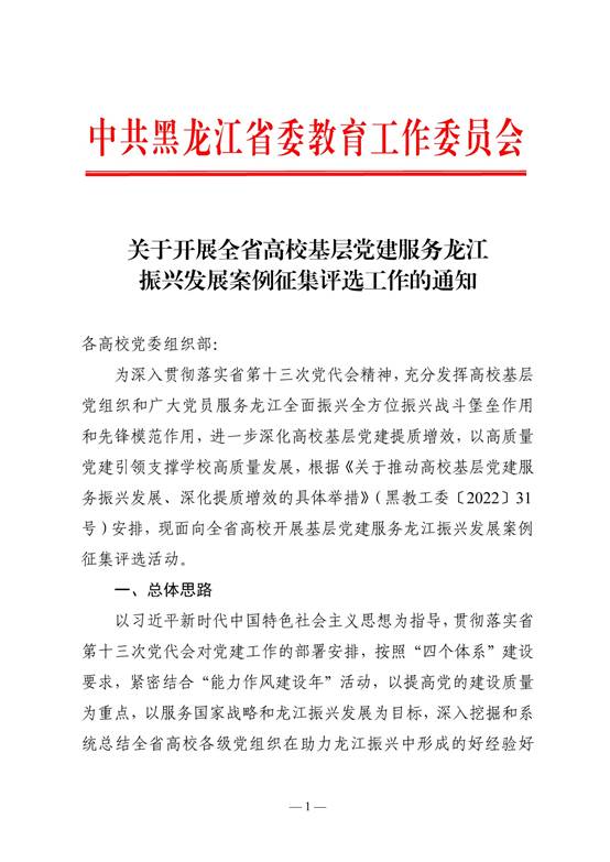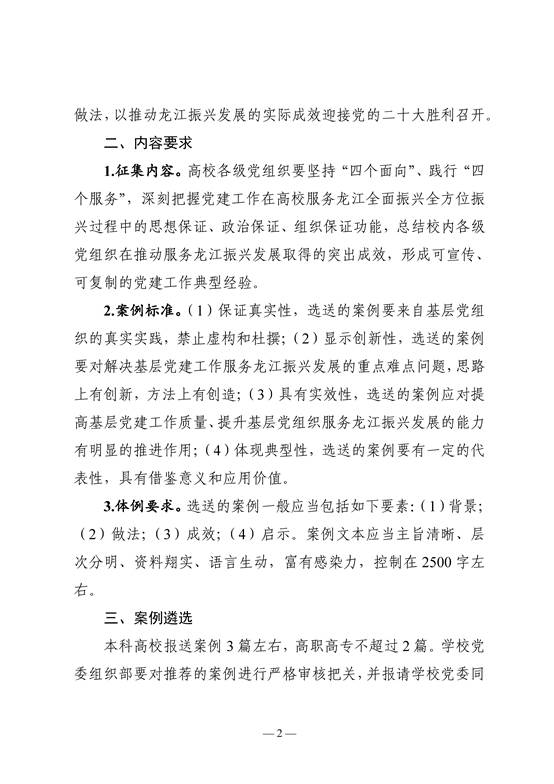 现将省委教育工委《关于开展全省高校基层党建服务龙江振兴发展案例征集评选工作的通知》文件转发给你们,请各基层党委(党总支)高度重视,深入挖掘和系统总结各级党组织在助力龙江振兴中形成的好经验好做法,以案例的形式形成可宣传、可复制的党建工作典型经验,学校党委将择优向省委教育工委推荐,参加 “全省高校基层党建服务龙江振兴发展最佳案例”和“全省高校基层党建服务龙江振兴发展优秀案例”评选,入选案例将向全国高校思政网、龙江先锋网等推荐,编制《黑龙江省高校基层党建服务龙江振兴发展案例汇编》,采取线上与线下相结合等多种方式对入选案例进行宣传展示。