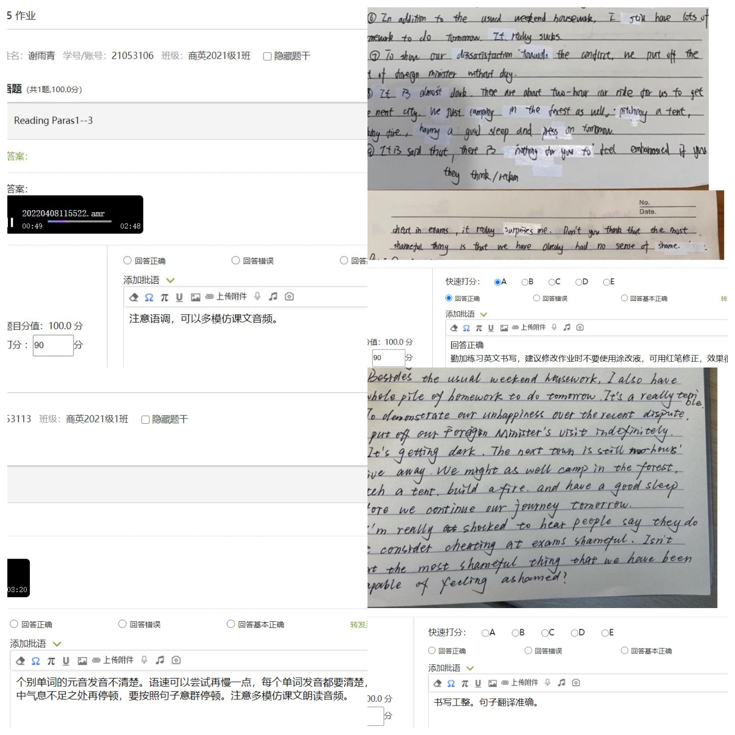 《综合英语》线上课程课后作业以口语作业提交和简答手写拍照提交方式进行,均使用学习通平台,学生提交作业后教师及时打分、写评语、给反馈。