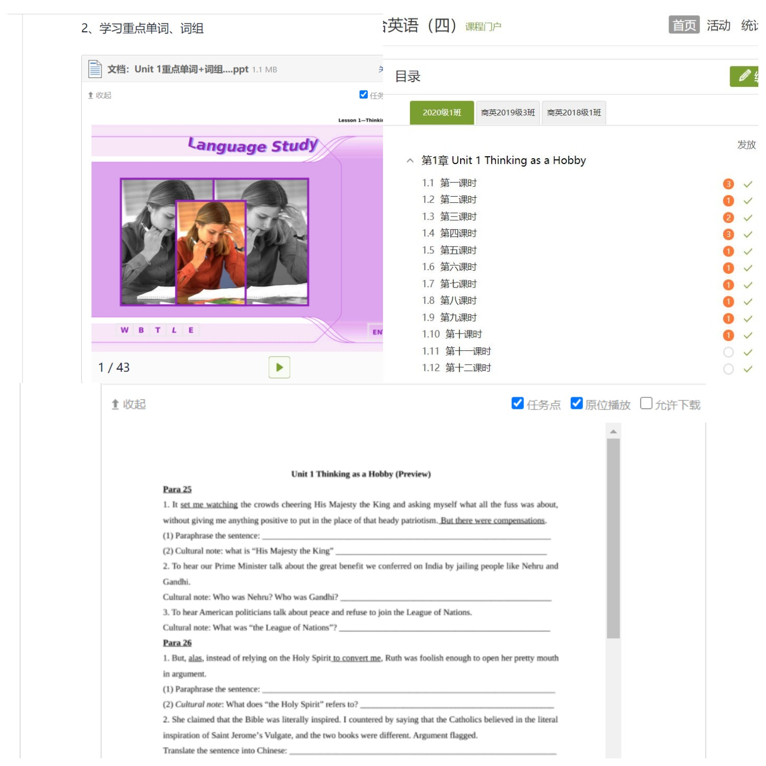 课前做好充分的教学准备,在硬件设备上以台式电脑或笔记本电脑、高清摄像头、手写板构成线上教学的基本用具,在软件方面,将《综合英语》课程的每个单元A篇课文、课后练习部分拆分成单独的PDF文件,结合课外学习参考文字资料、视频资料、预习任务清单,提前一周向学生发布。发布平台使用学习通和微信群,二者同时进行,以便于学生选择最便利的资料获取方式。