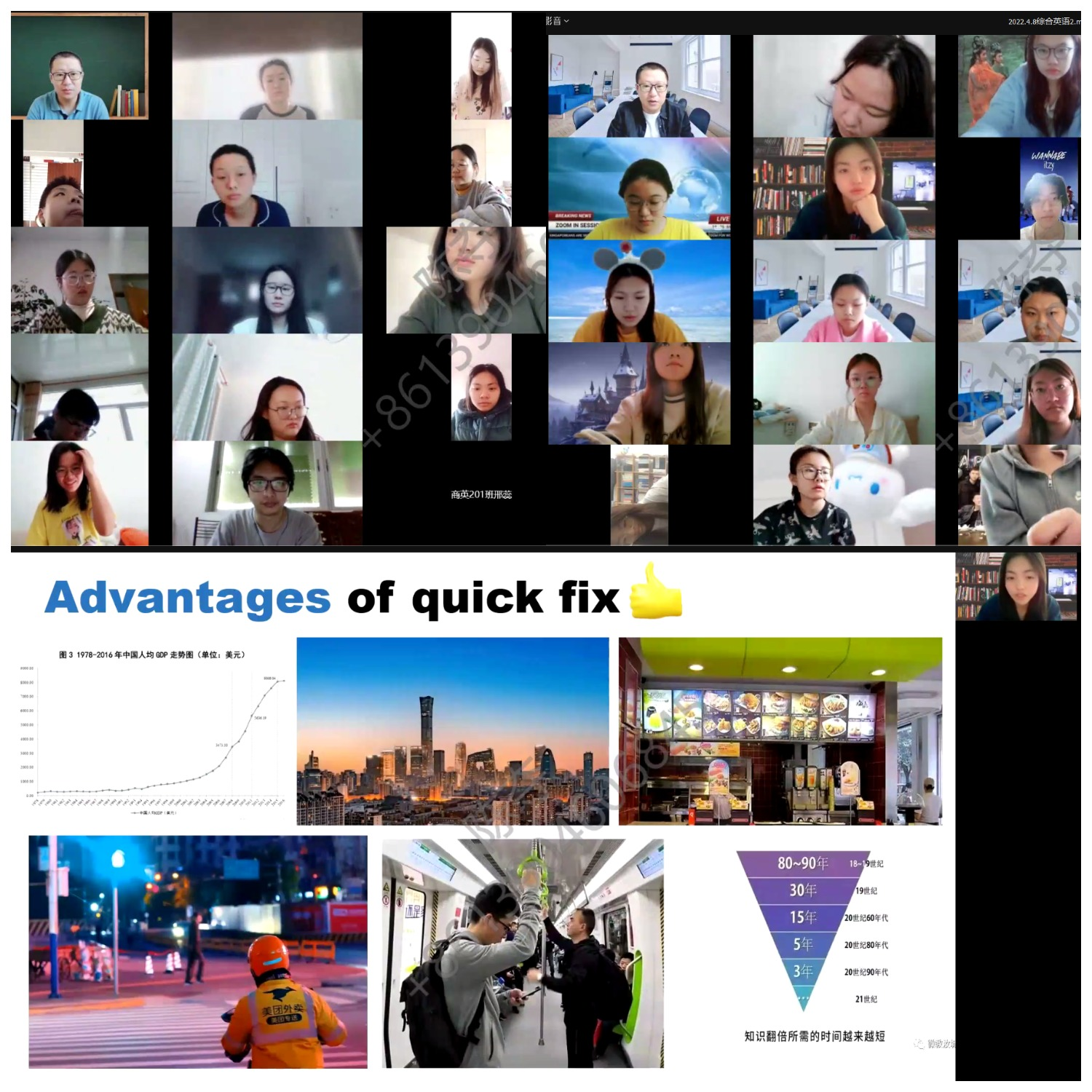 在2022年春季学期的线上教学中,外国语学院陈夺老师在认真总结过去一段时间线上课堂经验的基础上,积极探索,努力构建基于“腾讯会议直播 + 学习通”的线上智慧课堂模式,努力打造适于商务英语专业学生学习习惯的环境与授课方式,抓住提升学生英语语言运用能力这个基本点,线上课堂的授课效果得到学生的认可,尤其是《综合英语》课程既提升了学生的语言能力,又提高了学生的学习效率。
