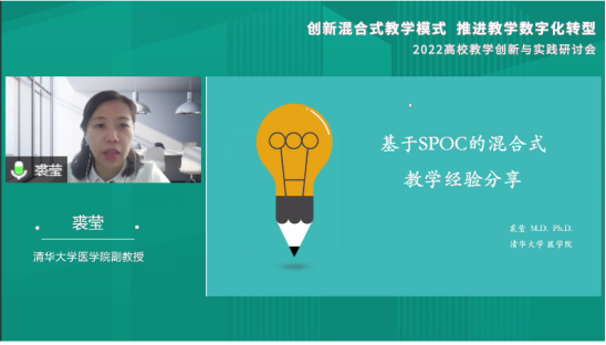 研讨会历时近三个小时,共有5场主题报告。分别是:教育部在线教育研究中心课程顾问、学堂在线大区经理虎佳子的《混合式教学模式探索与实践——一一流课程申报为例》、河北工业大学本科生院常务副院长马岱的《工业大学线上线下混合式教学模式的研究与实践》、清华大学医学院副教授裘莹的《基于SPOC的混合式教学经验分享》、四川大学化学工程学院副教授周加贝的《基于学堂平台开展混合式教学的实践与思考》、安徽工程大学电器工程学院副教授袁一鸣的《优质慕课本地化教学改革探索》。报告人分别以所教授的具体课程为实例,从一流课程申报、线上线下混合式教学创新、SPOC课程教学建设、教学工具与平台应用、数字教育资源优化等实践视角,阐述了混合式教学模式改革与创新理念,分享了教育信息化战略发展背景下教育教学改革及促进有效教学的实践经验。