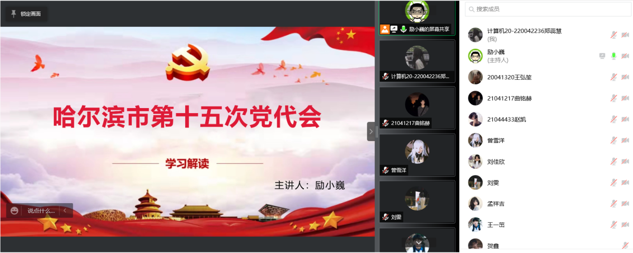 马克思主义学院分团委召开会议热议市第十五次党代会精神。分团委书记孟昭名带领全体同学一起观看“中国共产党哈尔滨市第十五次代表大会”在线直播,共同学习了会议精神,并分享感悟。同学们表示将结合专业深思细悟,领会精神实质,以高度的政治责任感和使命感,深刻把握大会报告的精神实质,牢记初心、担当使命、团结拼搏,奋力推进哈尔滨全面振兴全方位振兴,为全面建设社会主义现代化新龙江作出贡献。
