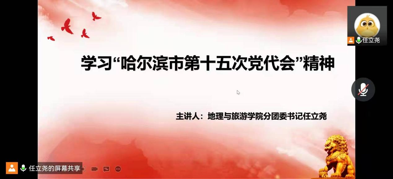 地理与旅游学院分团委召开会议学习贯彻市第十五次党代会精神。分团委书记任立尧传达了会议精神,强调党代会是在哈尔滨开启全面建设社会主义现代化新征程、加力推进全面振兴全方位振兴的关键时刻召开的一次重要会议,千钧重担在肩、使命无上荣光。同学们纷纷表态,将进一步提高思想认识、学思践悟,以学促行、以行践学,保持奋发有为的精神状态、时不我待的奋斗姿态,努力为哈尔滨高质量发展作出贡献。