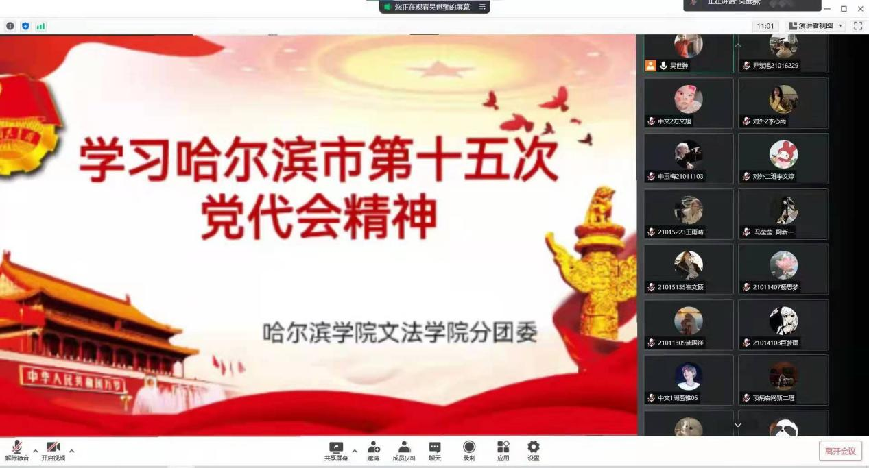 文法学院分团委召开线上会议热议市第十五次党代会精神。分团委书记吴世翀带领同学们学习了党代会报告中描绘的未来五年奋斗目标,了解了市委将站在新的历史起点,坚定信心、鼓足干劲,把握发展主动权,以发展解难题、以发展促振兴、以发展增福祉,加力推进全面振兴全方位振兴,全面领悟了党代会传达出的未来建设目标。团员青年听后备感振奋,纷纷发表自己的看法,并表示在校期间努力学习本领,成为助力哈尔滨未来振兴的中坚力量。