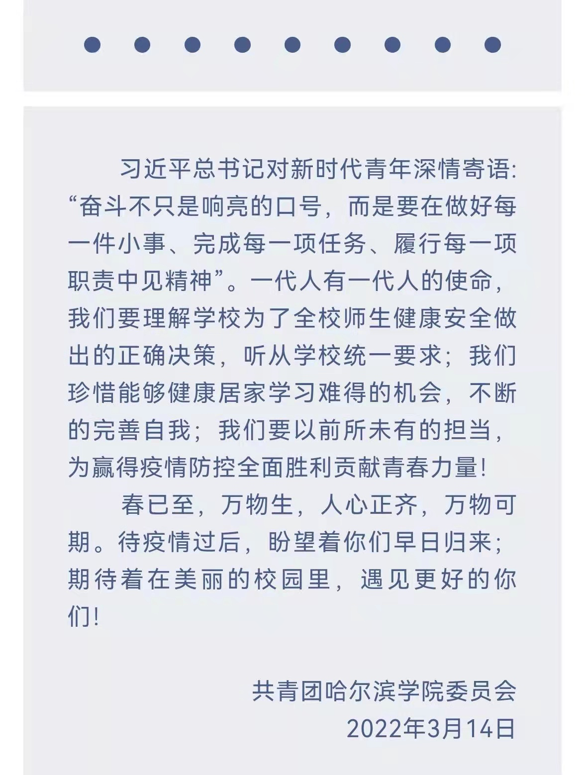 疫情就是命令,防控就是责任。校团委坚决贯彻市委、市政府、学校党委的要求,带领全体共青团员高举团旗跟党走,积极发挥好党的助手和后备军作用,引导哈院团员青年在抗击疫情中受教育、长才干、做贡献,筑牢防疫的青春长城,为坚决打赢疫情防控阻击战贡献青春力量。我们坚信,没有一个冬天不可逾越,没有一个春天不会来临!