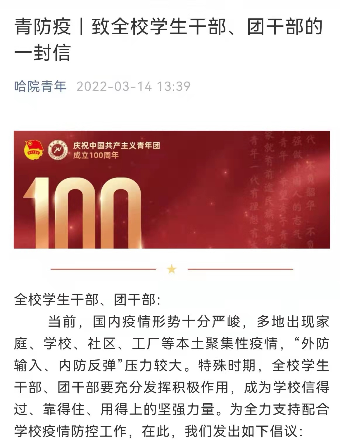 鉴于目前全国及我省我市疫情形势,为切实保障全校学生身体健康和生命安全,经学校研究,学生居家线上上课,返校时间预定3月28日(星期一)、29日(星期二)。我校团委及时发布“致全校学生干部、团干部的一封信”,号召全校学生干部、团干部要充分发挥积极作用,全力支持配合学校疫情防控工作,成为学校信得过、靠得住、用得上的坚强力量。