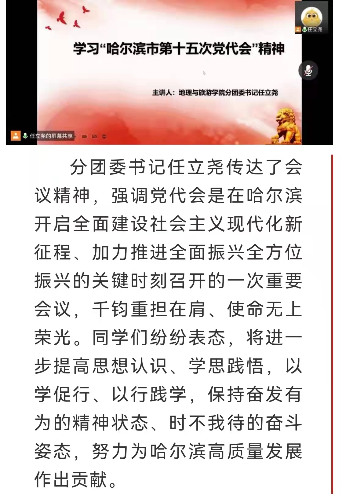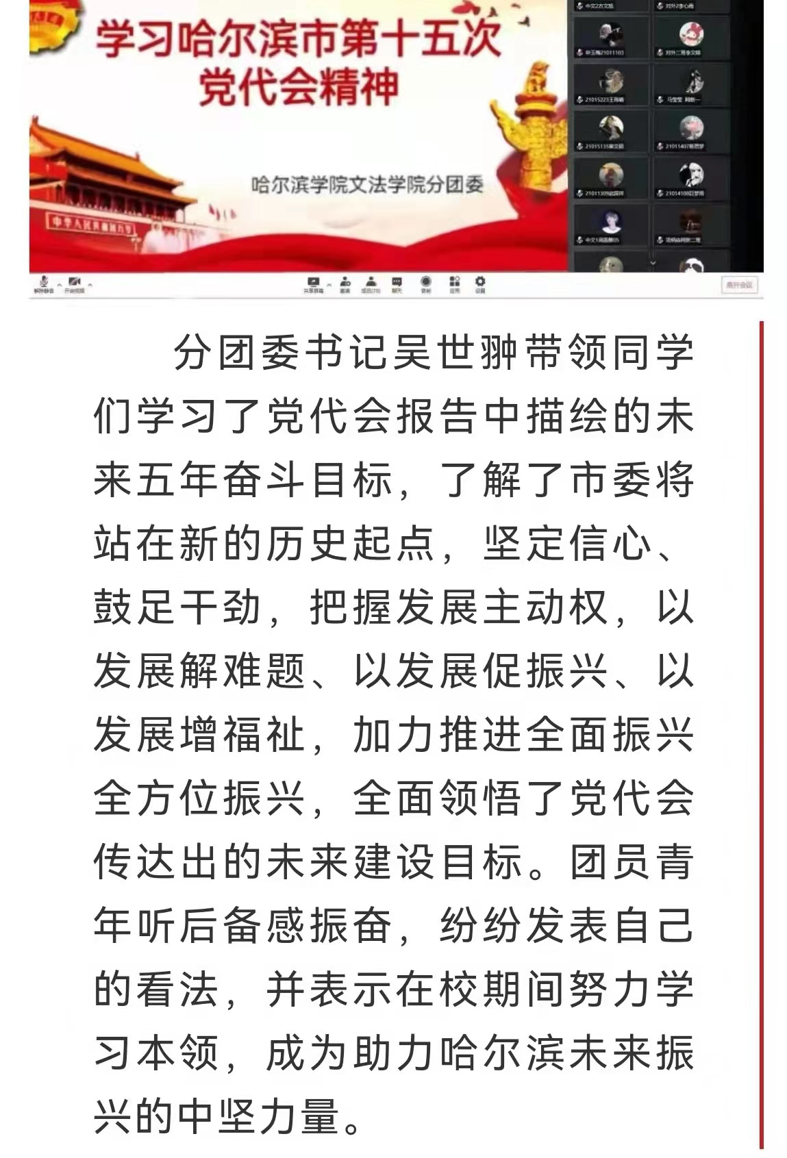 通过召开线上热议“学校第二次党代会精神”、“哈尔滨市第十五次党代会精神”、“2022年全国两会精神”的主题活动,带领全校团员青年学习党代会精神内涵,领悟党代会精神实质,汲取奋进力量,让党的声音直达学生心中,为打赢疫情防控阻击战打下坚实思想基础。