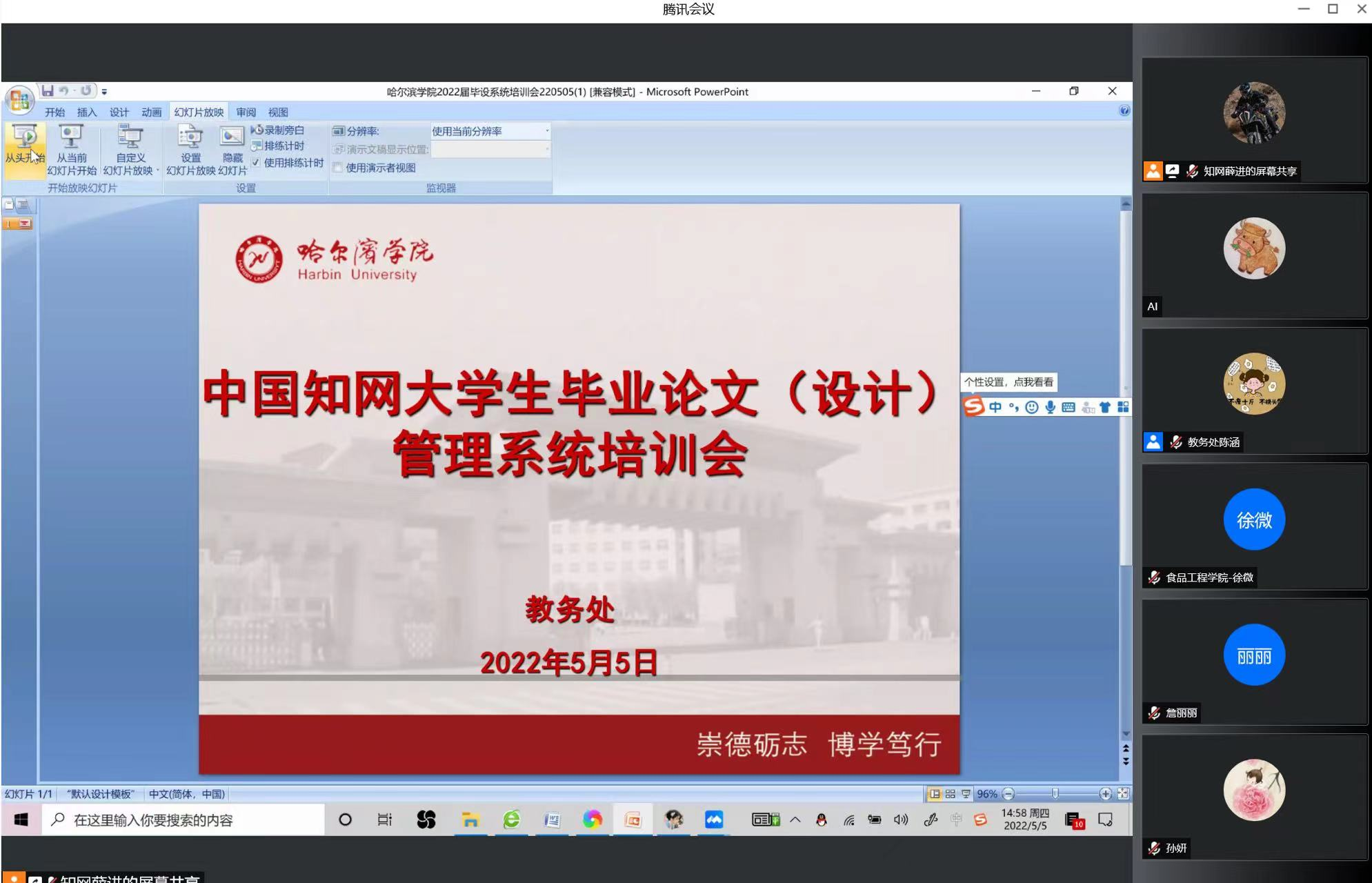 (文/陈涵)为进一步规范我校毕业论文(设计)管理工作流程,及时解决“毕设系统”使用过程中遇到的技术问题,确保高质量如期完成2022届本科毕业论文(设计)工作,5月5日下午,教务处组织召开“中国知网毕业论文(设计)管理系统”第二期培训会,各学院教学秘书、指导教师等200余人参加了本次培训会。会议采取线上形式召开。