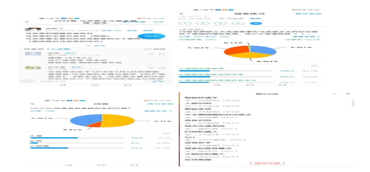 课后通过学习通平台了解学情,并有针对性地督促部分同学,与同学建立良好的沟通。通过微信和学习通平台推送给学生值得阅读的相关文化和视频资料进行深度学习,在网络上与学生进行充分的沟通和交流,第一时间解答同学们的疑问和生活中的困惑,缓解同学们的焦虑情绪,让同学们感受到思政课的高度、深度和温度。