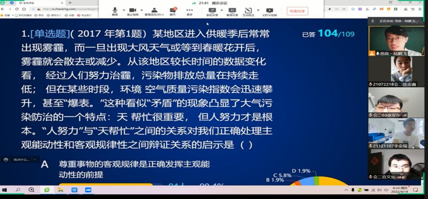 课中参与式教学环节主要采取三种教学策略:一是理论深度精讲式教学,二是启发引导式教学,三是案例分析式教学。为了更好地调动学生网络学习的积极性和参与度,在腾讯直播的同时,采取主体讨论、案例分析、抢答、随机选人、随堂测验等多样化线上教学活动,有效提升学生课堂的参与度和获得感;在课程内容上,将抗疫故事和时政热点融入课程教学;并组织学生分小组展示“运用马克思主义世界观和方法论分析社会现实”的特色课堂实践活动,更好地提升了学生理论联系实际的能力,进而提升课堂教学效果。