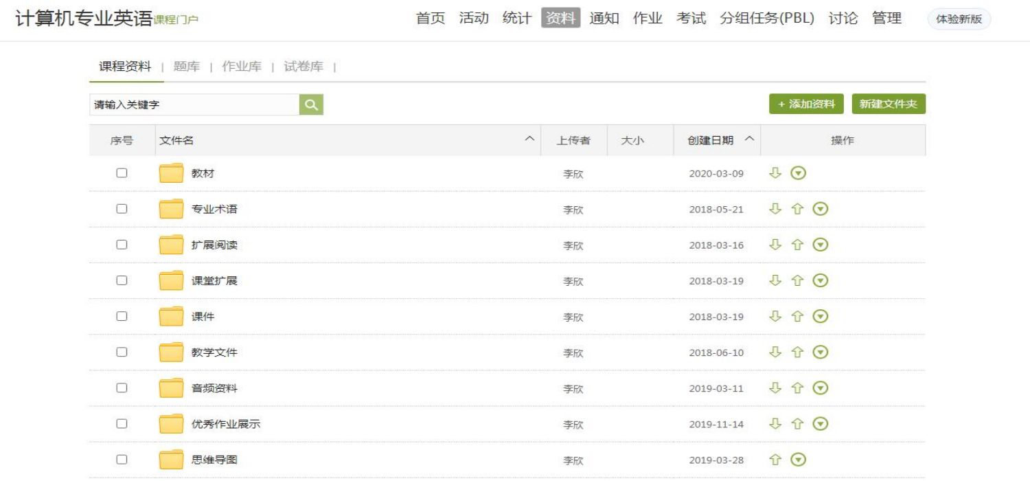 课程资源是实现教学目标的支撑条件,没有丰富的课程资源支撑,教学目标就成了无源之水,无本之木。通过多年的积累,本门课程在学习通平台上分类整理了视频、音频、图片、文本等多种形式的课程资源,涵盖:教材、课件、扩展阅读、专业术语、思维导图、学生优秀作品等多个方面,供学生使用。