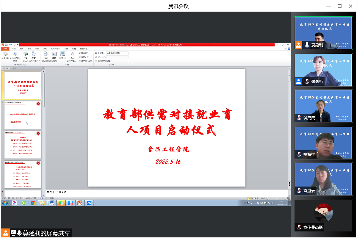 5月16日,项目组全体成员通过线上会议形式与合作企业举行了教育部供需对接就业育人项目启动仪式。会议由食品工程学院副院长莫延利主持,参加会议的有:就业工作处柳鸿莉、食品工程学院副处级辅导员张玉娟、化学系主任宫显云、食品系主任屈岩峰、19级辅导员侯成成。南京诺唯赞生物科技股份有限公司人力资源部校企合作负责人褚海洋、谭龙雨,基础研究综合部部门经理谢丹、生命科学部质检部经理任顺利。双方就项目实施预期目标、项目实施方案和项目实施计划进行了交流。