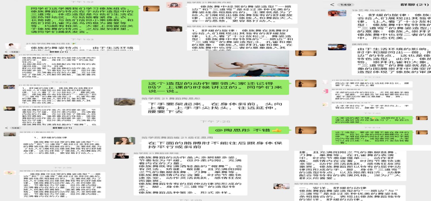 舞蹈艺术是一门时空艺术,在授课当中对于空间视觉感受和音乐听觉感受要求较高,网课期间无疑给我们的线上教学带来了不小的阻力。但我们克服困难,最终在网课教学中取得了不错的效果。
