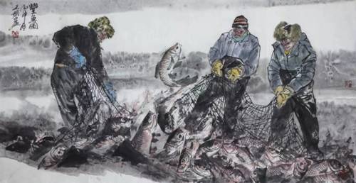 王斌教授的入选作品《丰鱼图》运用水墨语言塑造了一群不畏艰难战胜一切险阻的劳动者的形象和渔民冬捕动人的场面,以写实造型的朴素手法,强调真实感,使观者有如身临真人真境,让我们同感共享了淳朴的渔人和壮观的捕鱼场景。反映我们的时代和人民的精神面貌,生动诠释了艺术为人民的根本宗旨。