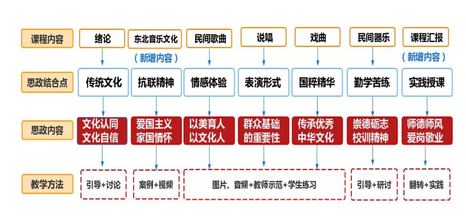 响应“立足地方、服务龙江地方音乐教育、文化建设和社会发展”的办学定位,结合“传承抗联精神,赓续红色基因”的专业特色,在课程内容中增设具有地方特色的东北音乐文化专题,其中包括东北民间音乐、东北抗联音乐和黑龙江少数民族音乐。此部分内容的增设,让学生了解龙江优秀文化的同时,增强中华民族共同体意识,弘扬东北抗联精神,践行爱国主义、家国情怀、艰苦奋斗、不怕牺牲的社会主义价值观。
