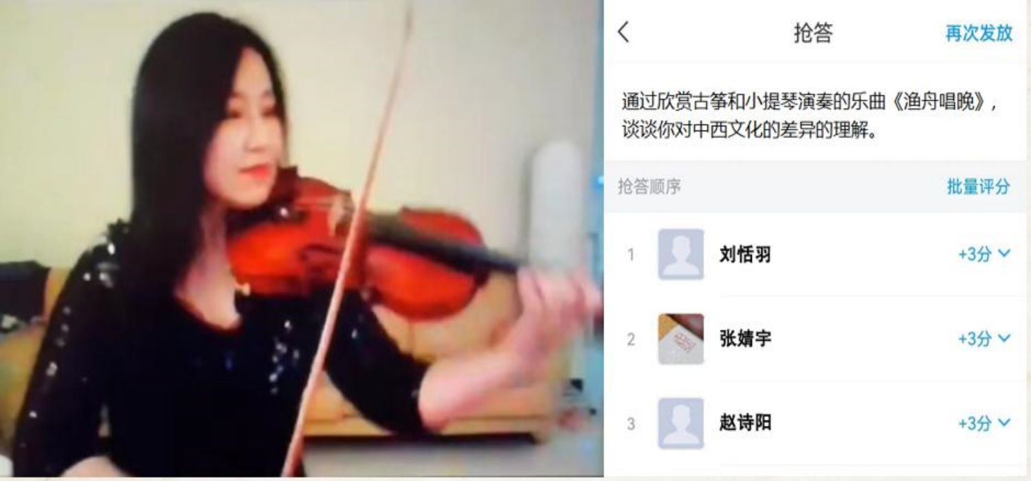 教师直播授课运用小提琴演奏代表性作品,启发学生进行中西文化比较分析