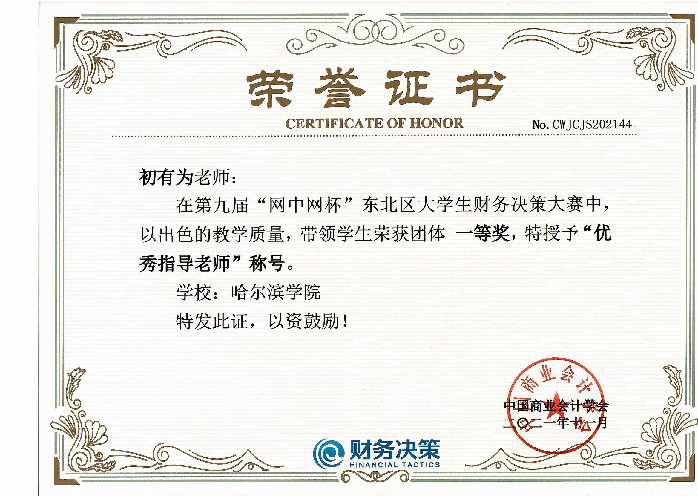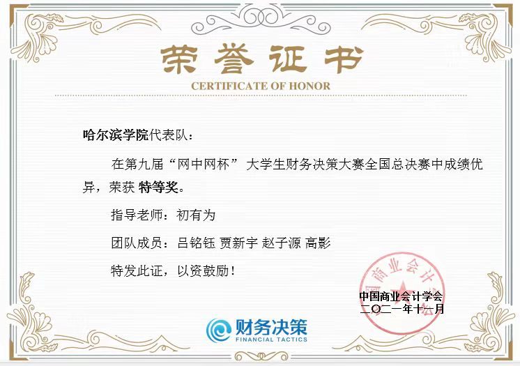 日前,第九届“网中网杯”大学生财务决策大赛全国总决赛落下帷幕。经济管理学院财务管理系初有为主任带队指导,财务管理专业吕铭钰、贾新宇、高影和赵子源四名学生组队代表学校参赛,在前期系列赛中以黑龙江省赛第一名、东北大区赛第一名的优异成绩挺进决赛。决赛中凭借扎实的专业功底和良好的临场发挥,实现历史突破,以全国总分第一的骄人成绩喜获特等奖。