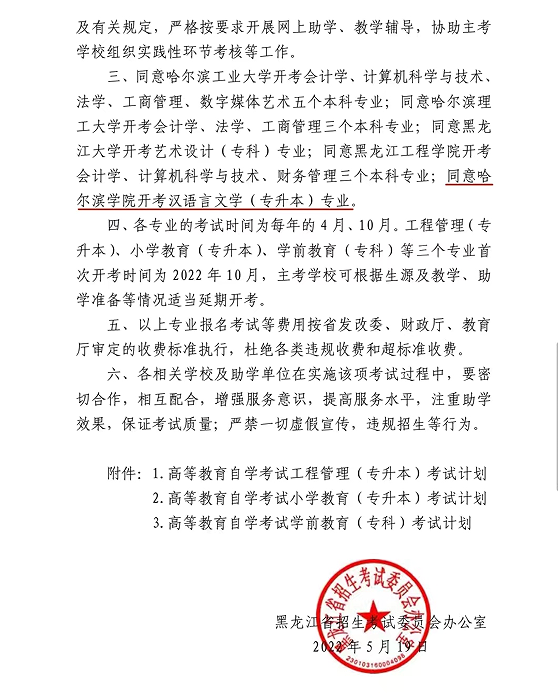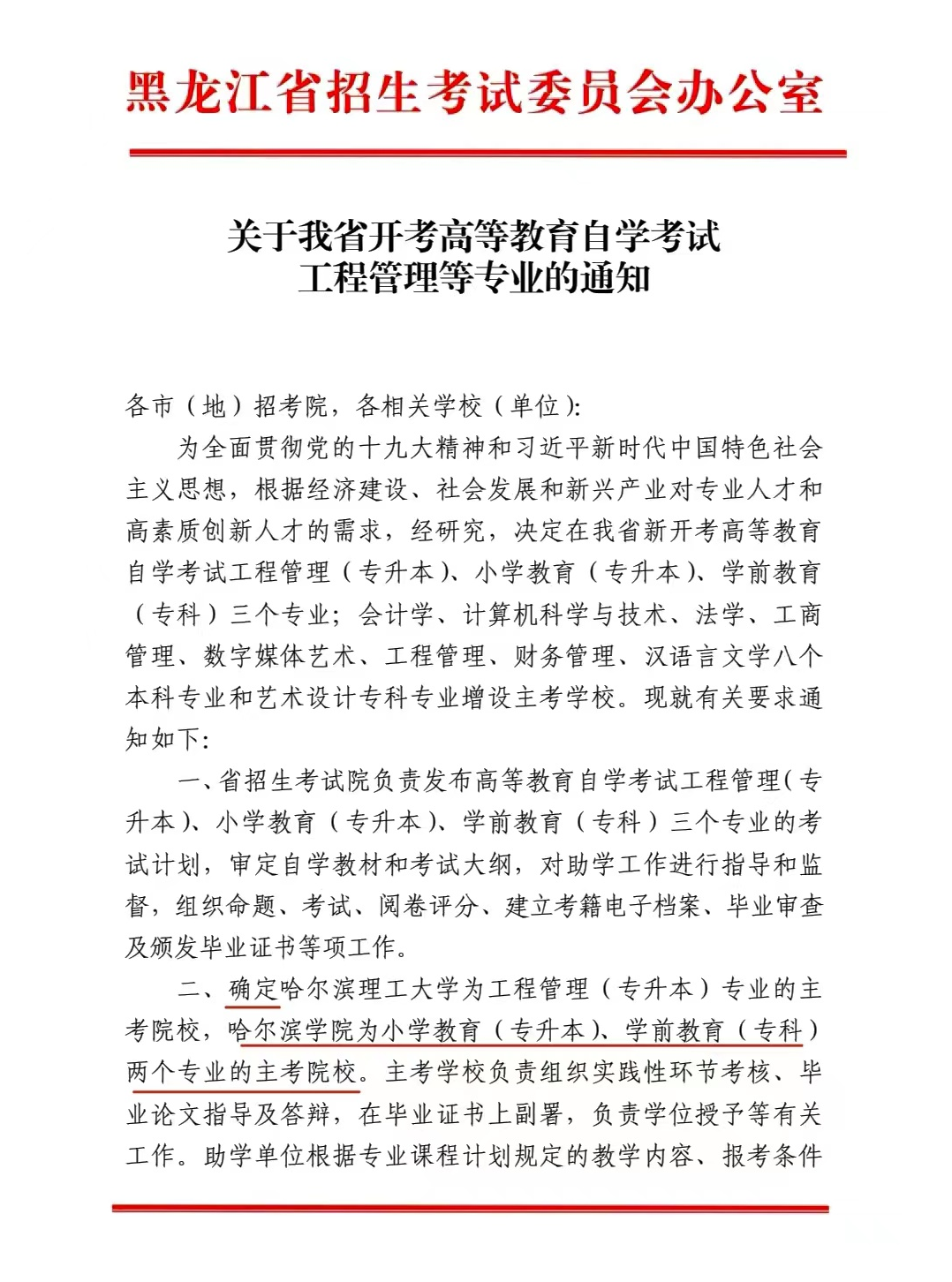 根据教育部和黑龙江省关于推进创新发展高等教育自学考试的相关要求,为进一步适应和满足全社会对专业型、创新型人才的需求,推进地方经济发展,结合我校的自身办学优势及当前我省多层次自学考试需求量增加的现状,在充分调研的基础上,我校于2022年4月申请担任小学教育专业(本科)、学前教育专业(专科)主考单位。在省招生考试院召开的专业论证会上,与会专家对我校申请的开考专业给予高度好评和大力支持。经批准,我省新开考小学教育专业、学前教育,由我校担任该专业的主考院校。
