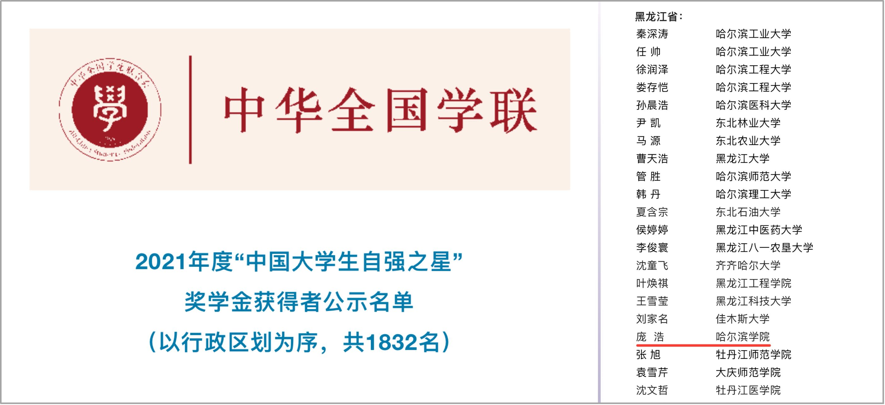 (文/黄婷婷)为深入贯彻落实习近平总书记关于青年工作的重要思想,围绕迎接和学习宣传党的二十大,结合庆祝建团100周年,进一步用身边的榜样力量引领广大同学不断坚定理想、传承红色基因,鼓励新时代青年以青春之我践行“强国有我”青春誓言。近日,共青团中央、全国学联、中国青年报社揭晓公布2021年度“中国大学生自强之星”奖学金获得者名单。我校学生党员、优秀共青团干部标兵庞浩同学,经高校推荐、省级初评、全国评审等环节,荣获“中国大学生自强之星”荣誉称号。