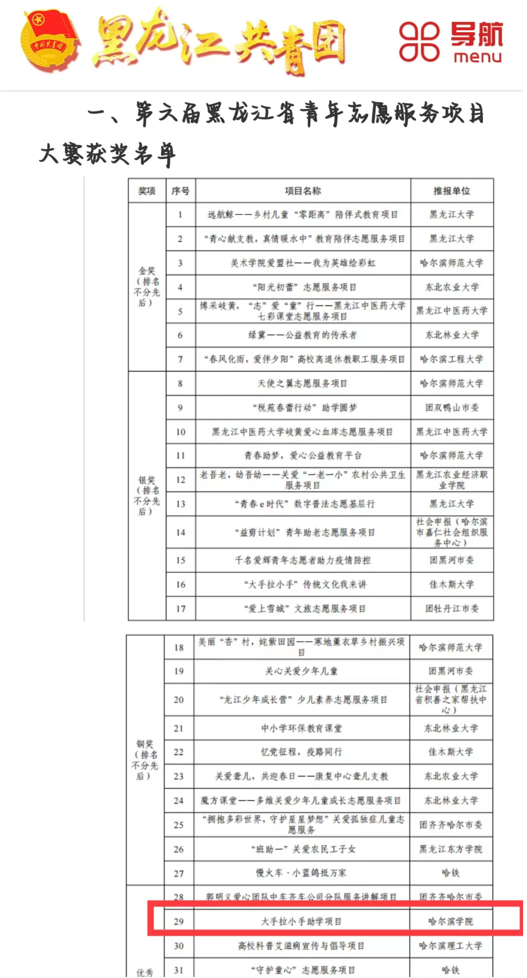 (文/黄婷婷)2022年9月14日由共青团黑龙江省委员会主办的第六届黑龙江省青年志愿服务项目大赛圆满落幕。本次活动经各市(地)团委、各省管企业团委、各高校团委等单位组织推报,共138个青年志愿服务项目参与评选。经资格审查、材料初评、项目终评,评选出第六届黑龙江省青年志愿服务项目大赛金奖7个、银奖10个、铜奖10个、优秀项目奖11个。经过激烈的角逐,我校团委推荐的马克思主义学院爱微益社团《大手拉小手助学》项目荣获“黑龙江省青年志愿服务项目大赛优秀奖”。