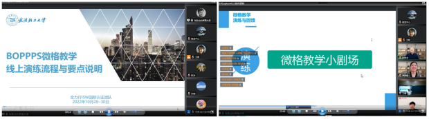 在10月29日至30日教学演练中,新教师基于BOPPPS教学理念进行了两轮微格线上教学设计与演练。新教师以教授者、学习者、反馈者三重身份参与活动,张胜全教授及其团队专家分别在每个小组对教师的演练进行了反馈、指导与互动。