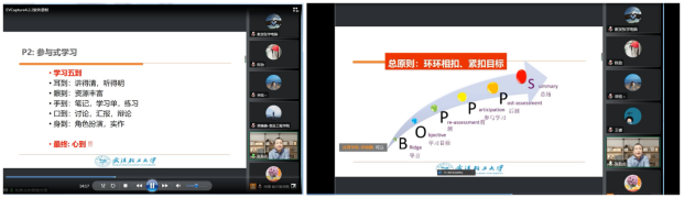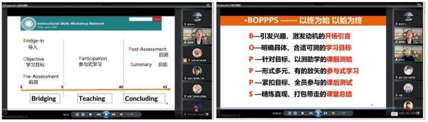 在10月28日的专题讲座中,张胜全教授及其团队专家对BOPPPS有效教学理念、结构进行了全面、深入的阐述;通过微型教学设计案例赏析,结合BOPPPS教学的导入、目标、前测、参与式学习、后测和总结六个环节,对“以学生为中心”的线上教学互动技巧与参会教师进行了互动式研讨;通过王睿老师的《教育学》课程教学实例,对BOPPPS线上微格教学设计及演练过程进行了反馈与指导,引发了新教师对教学设计与教学实施的反思。