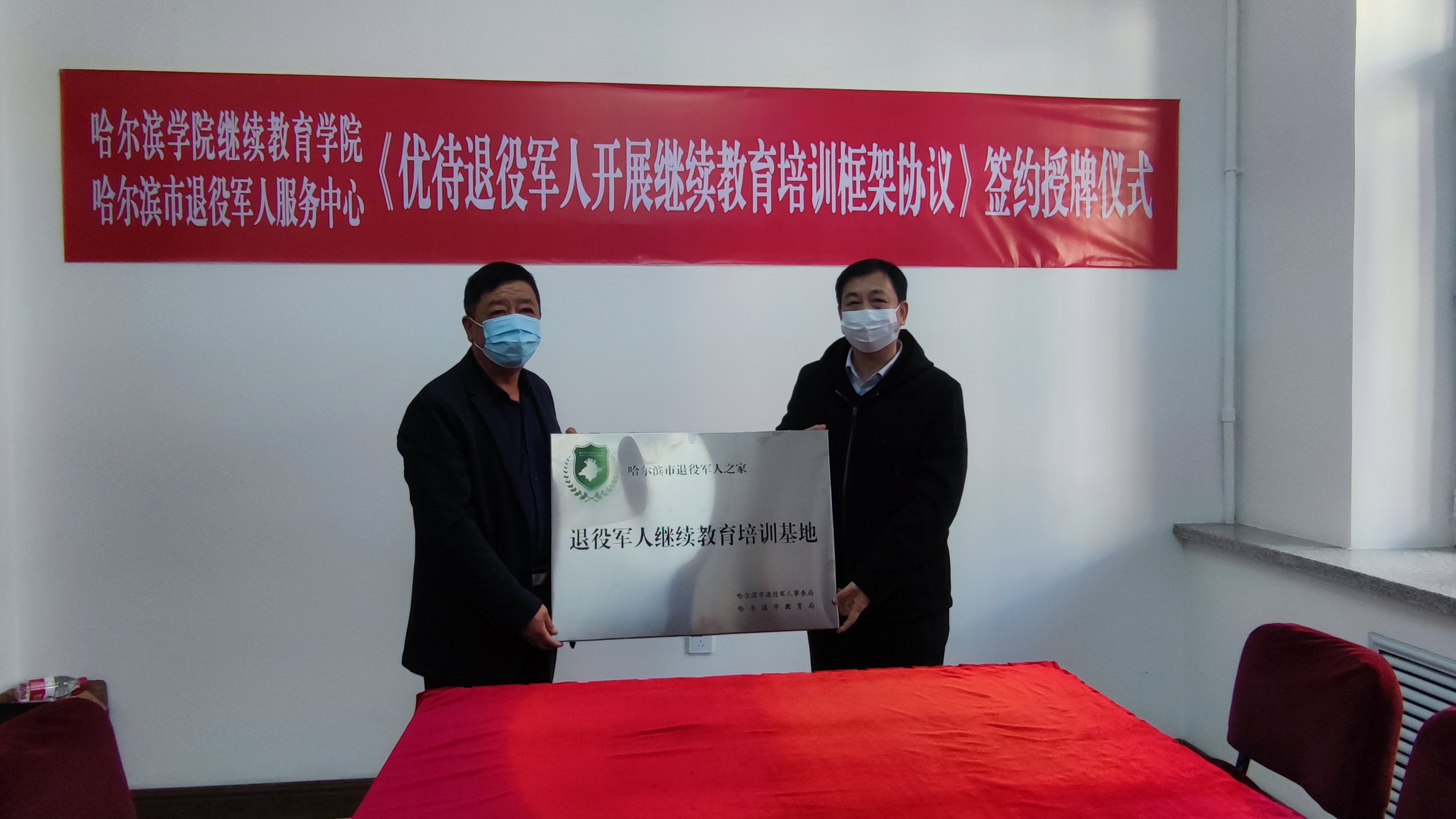 (文/贾明)11月1日,哈尔滨学院、哈尔滨市退役军人服务中心签订《关于优待退役军人开展继续教育培训框架协议》,依托哈尔滨学院继续教育学院建立哈市首家市级“退役军人继续教育培训基地”,我校副校长孙红镱,哈尔滨市退役军人服务中心党委书记、主任王利民出席签约仪式。双方单位相关职能部门负责人参加了本次活动。