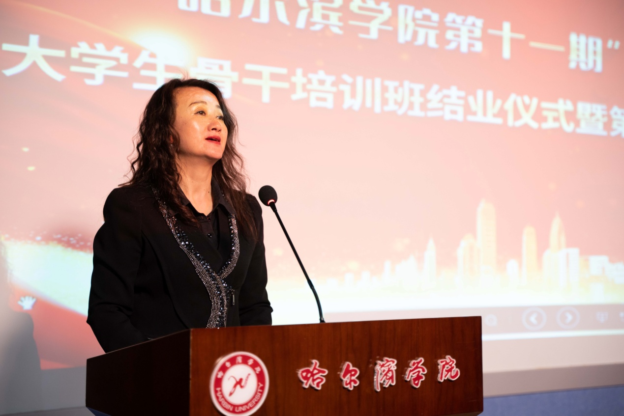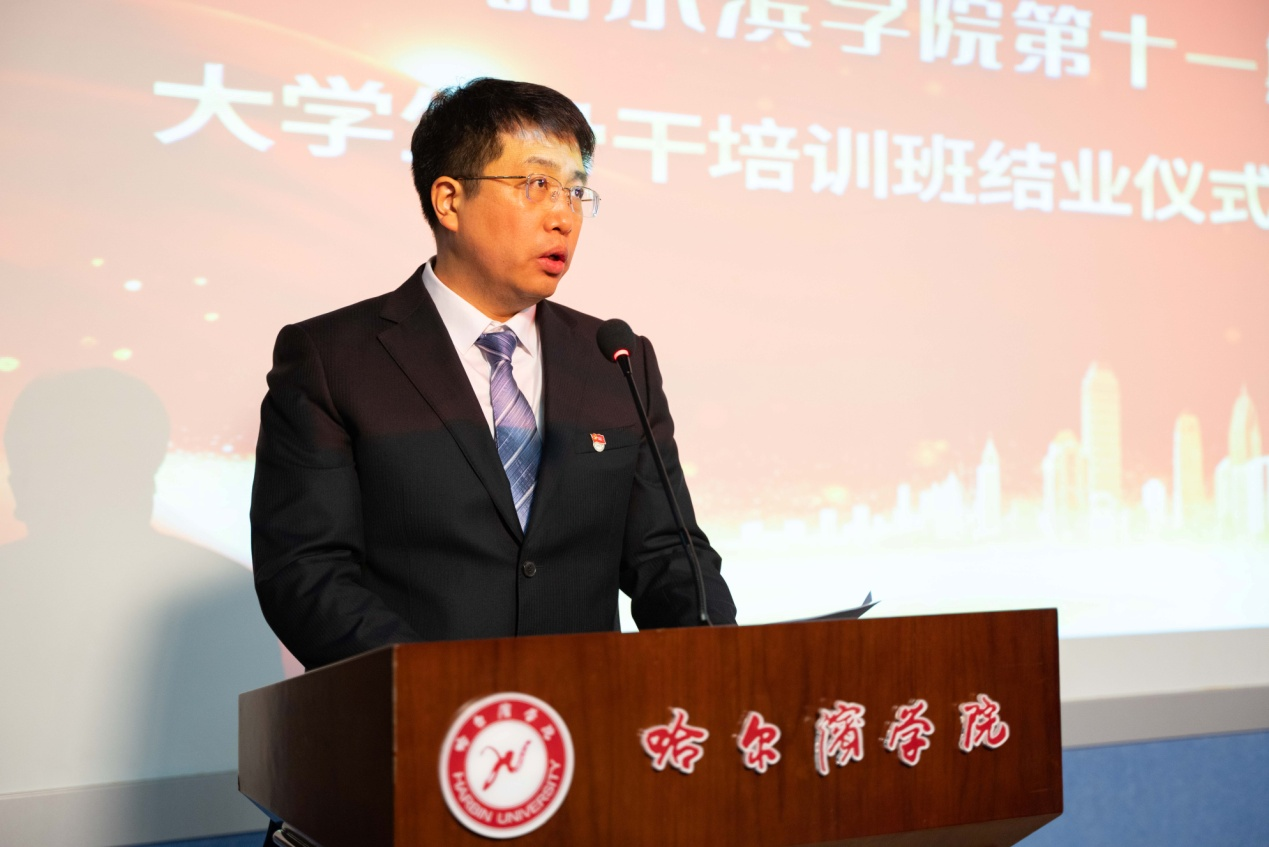 最后,校党委委员、副校长吴旭峰发表讲话对全体“青马学员”提出三点希望:一要坚定理想信念、牢记初心使命。努力成长为党、国家和人民所期盼的有志青年。二要坚持学以致用,勇攀科技高峰。主动将自己的梦想融入中国梦,脚踏实地、埋头苦干,用智慧才干开创自己的事业,在创新创业中展现才华、服务社会。三要勇于担当奋斗,甘于无私奉献。要继承“永久奋斗”的光荣传统、发扬“越是艰险越向前”的斗争精神,为全面建设社会主义现代化国家贡献青春力量。期待我校全体“青马”学员通过此次学习认真思考自己要树立什么样的人生目标,能够做到脚踏实地,砥砺前行,不懈奋斗,让“青马”工程成为锤炼自己政治思想素质的摇篮,通过一个个榜样的树立让入选“青马班”成为全体哈院青年最重要的荣誉和追求。