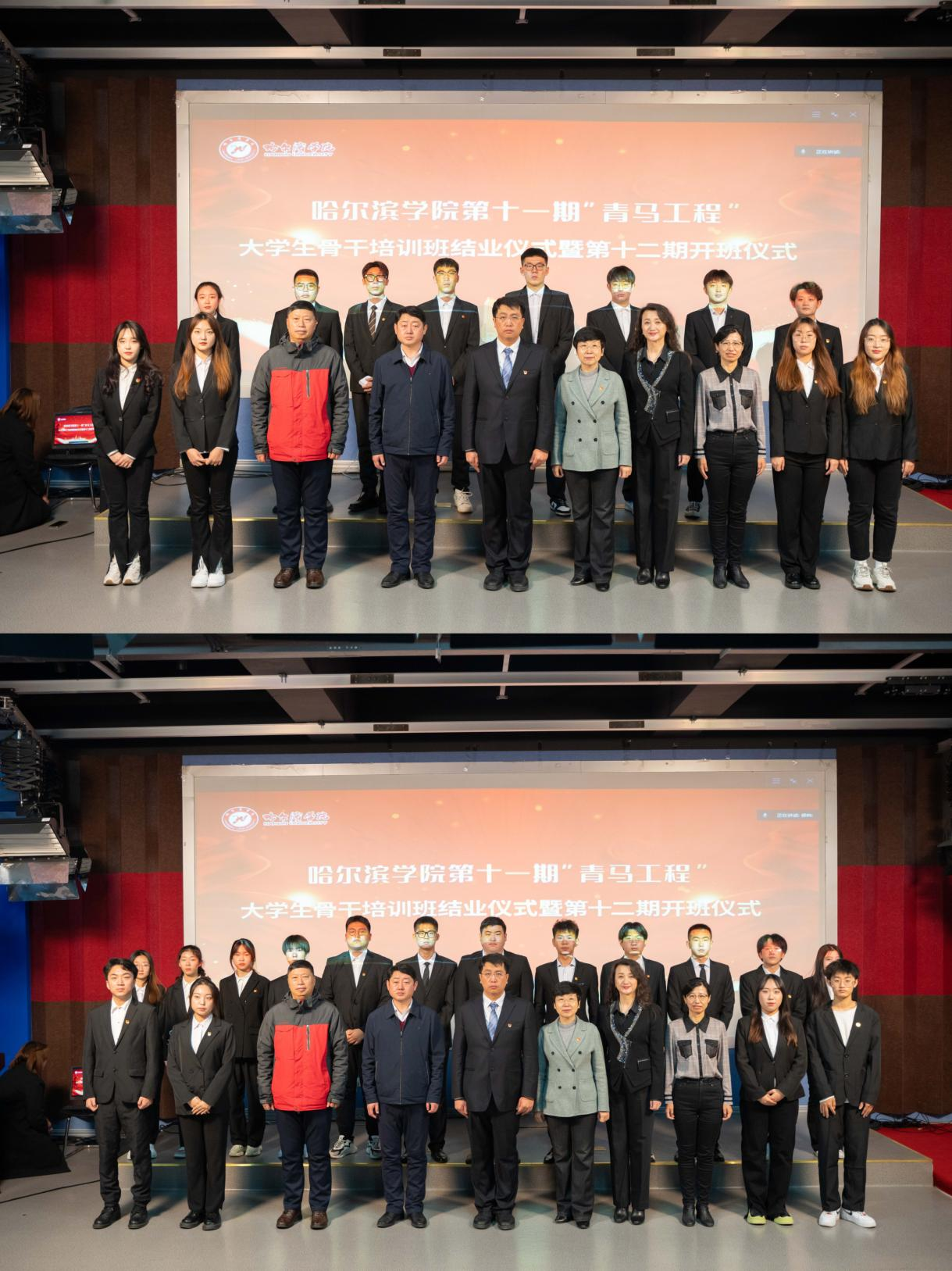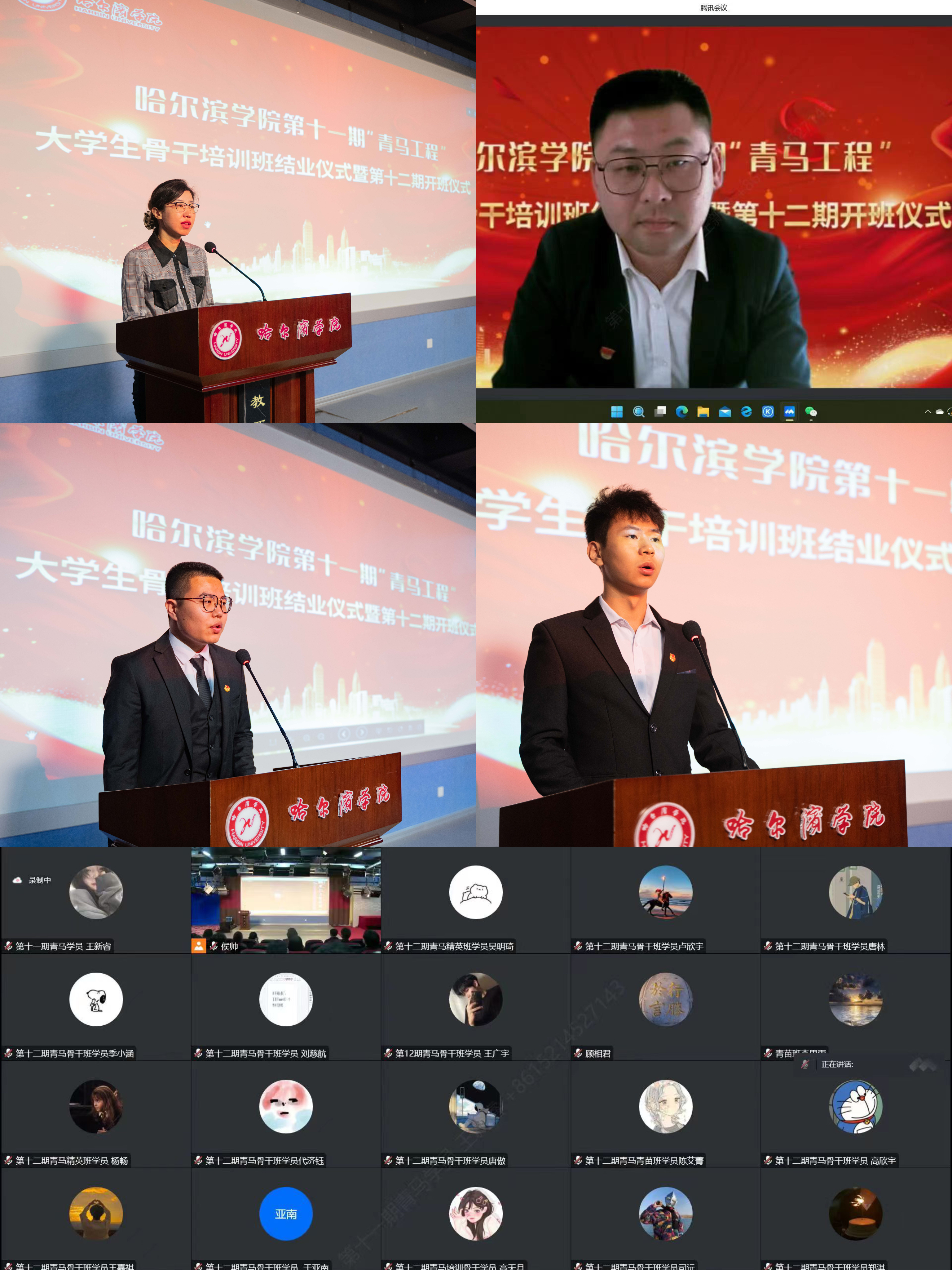 (文/顾相君、张玉娟)为贯彻落实党的二十大精神,着力培养和输送对党忠诚、信仰坚定、能力突出、素质优良、作风过硬的青年政治骨干,校团委于11月16日14时在1401举行我校 “青马工程”培训班第十一期结业式暨第十二期开班仪式。校党委委员、副校长吴旭峰,党委组织部部长丛军、党委宣传部部长李铁岩、马克思主义学院院长孙芳、学生处副处长丛全喜、校团委负责人张玉娟,“青马工程”培训班第十一期、第十二期学员代表共30人在主会场参加开班式,各学院分团委书记、全体学员通过腾讯直播平台同步观看开班仪式。开班式由团委副书记(挂职)顾相君老师主持。