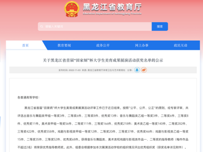 (文/鲁晓隆)2022年11月3日黑龙江省教育厅官方网站公示了黑龙江省首届“田家炳”杯大学生美育成果展演活动获奖名单。哈尔滨学院艺术与设计学院共50件作品获奖,一等奖7件、二等奖12件、三等奖16件、优秀奖15件。9位教师荣获优秀指导教师奖。