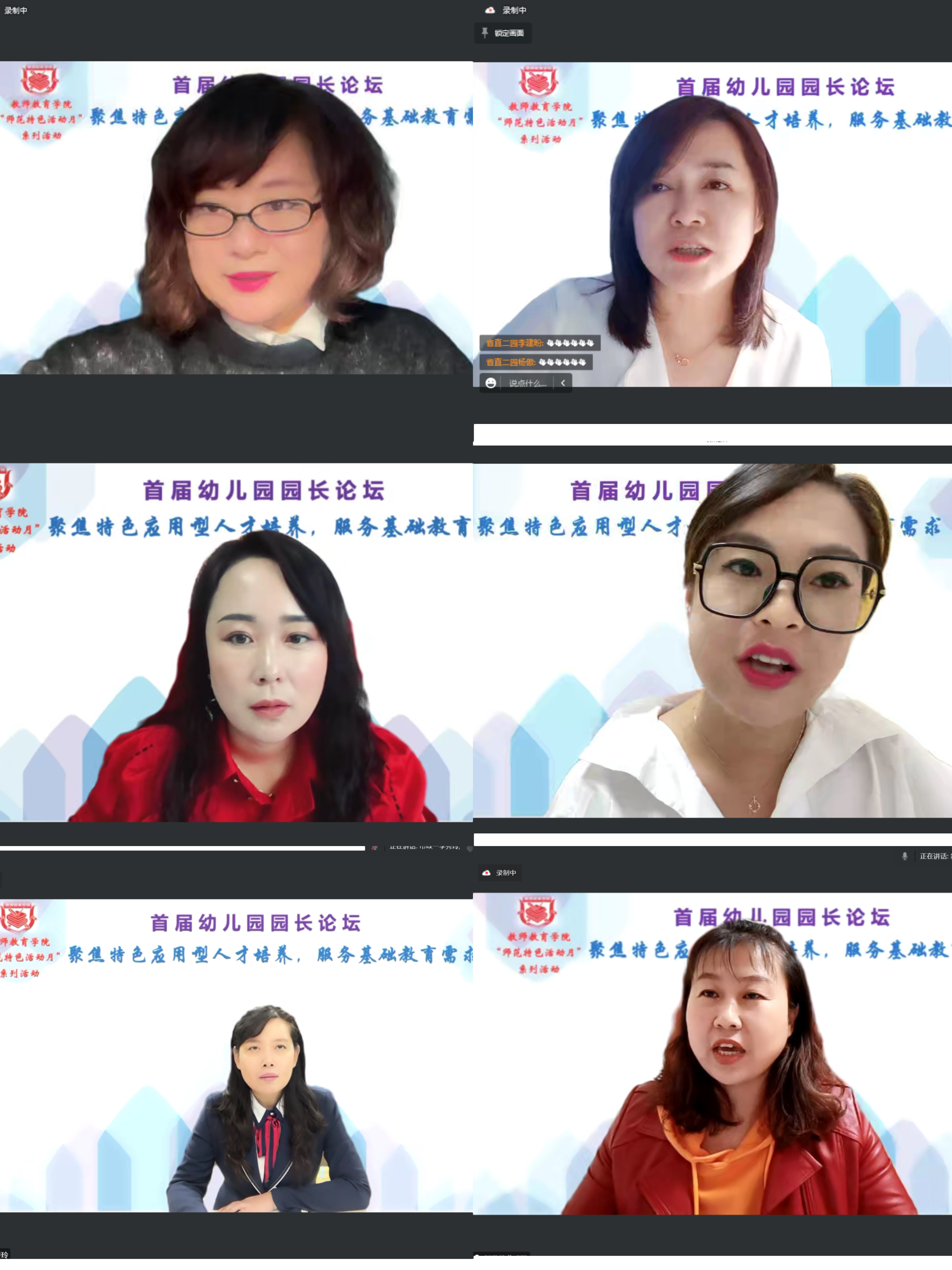 园院共建论坛由刘亨荣副院长主持,我院师生与各位园长围绕“安吉游戏在幼小衔接中的实践探索”“品德启蒙教育与园本课程的结合”及“安吉游戏实际开展过程中的家长反馈”等话题展开讨论,园长们与师生们各抒己见,线上学术交流气氛热烈。