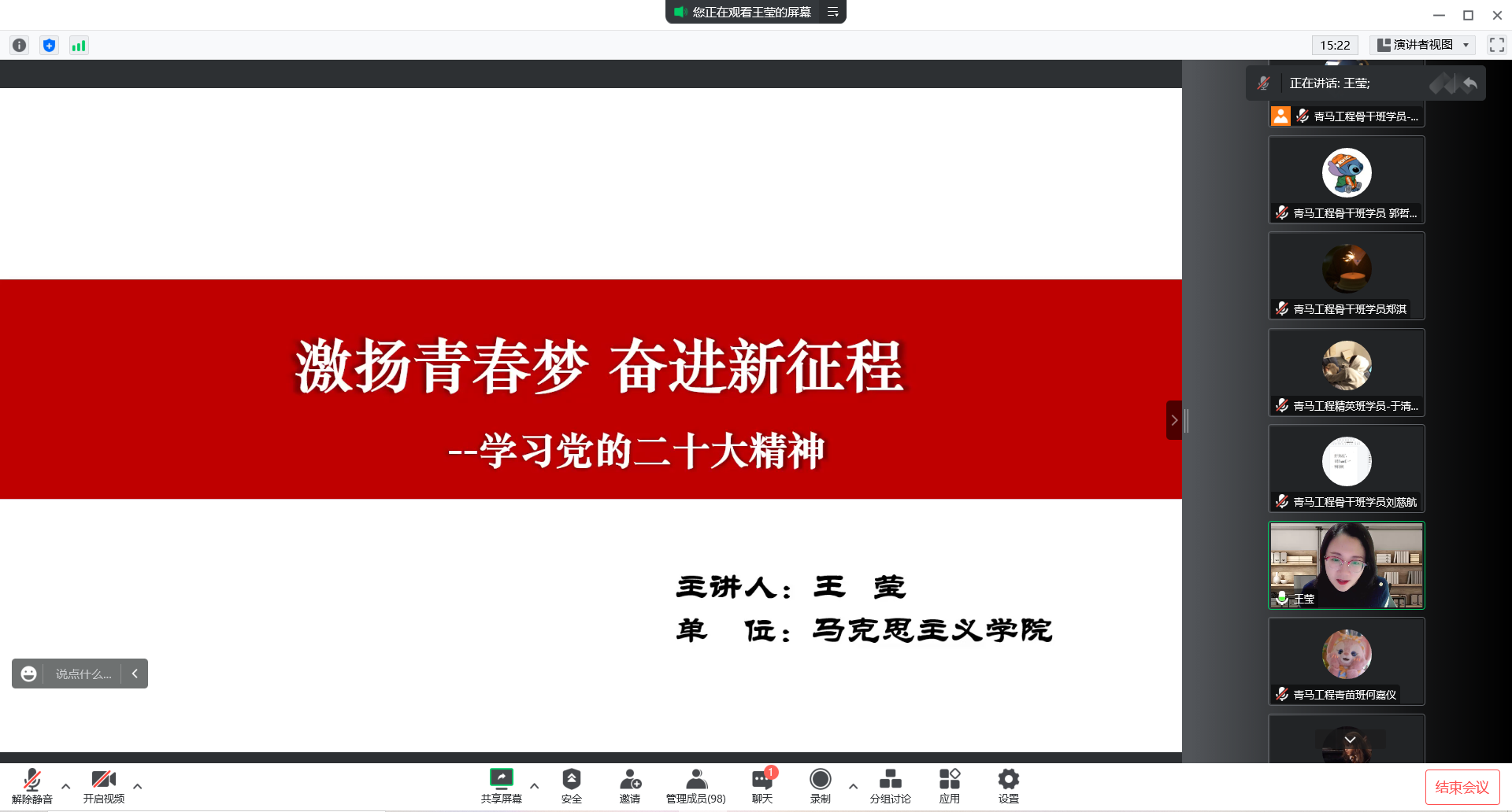 (文/黄婷婷)为深入学习贯彻党的二十大精神,加强对青年的思想政治引领,为党培养一批信仰坚定、能力突出、品学兼优、作风过硬的青年政治骨干,11月25、26日,我校第十二期“青马工程”培训班百余名学员通过线上学习的方式开展集中理论学习。马克思主义学院王莹老师、王啸老师分别开展了《激扬青春梦,奋进新征程》《新时代新征程坚持和发展中国特色社会主义的政治宣言和行动纲领——准确学习贯彻党的二十大精神》专题理论培训。