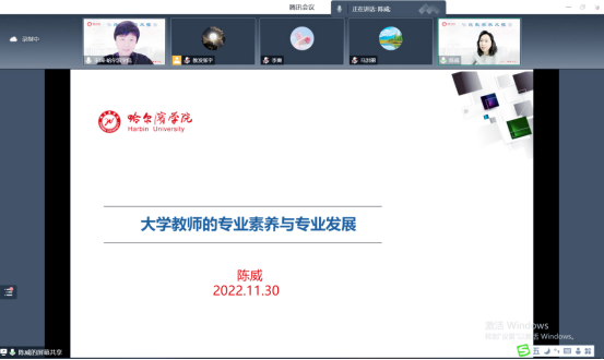 (文/马洪丽)为帮助我校教师树立科学教学发展理念,助力教师专业成长,11月30日下午,教师教学发展中心邀请哈尔滨幼儿师范高等专科学校校长陈威教授作了题为《大学教师的专业素养与专业发展》的学术报告。报告同时是2022年新教师教学发展研修课程,由教师教学发展中心主任宋阔主持,通过腾讯会议进行线上直播,2022年新教师教学发展研修班学员、各学院教师代表等近300人参加。