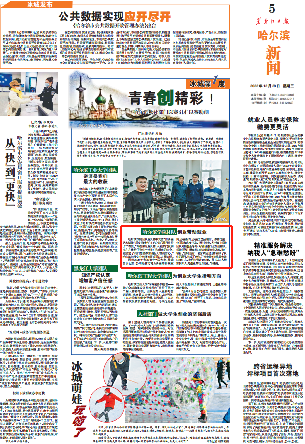 (文/李健)为进一步宣传大学生创业精神,近日,黑龙江日报对哈尔滨市大学生创业大赛历年来的优质项目进行了专题报道,我校大学生创业园在孵企业----“哈尔滨初沙文化传播有限公司”与哈尔滨工业大学、哈尔滨工程大学、黑龙江大学四所院校的创业典范脱颖而出,在2022年12月28日黑龙江日报 “青春创精彩”版块进行了专题报道。